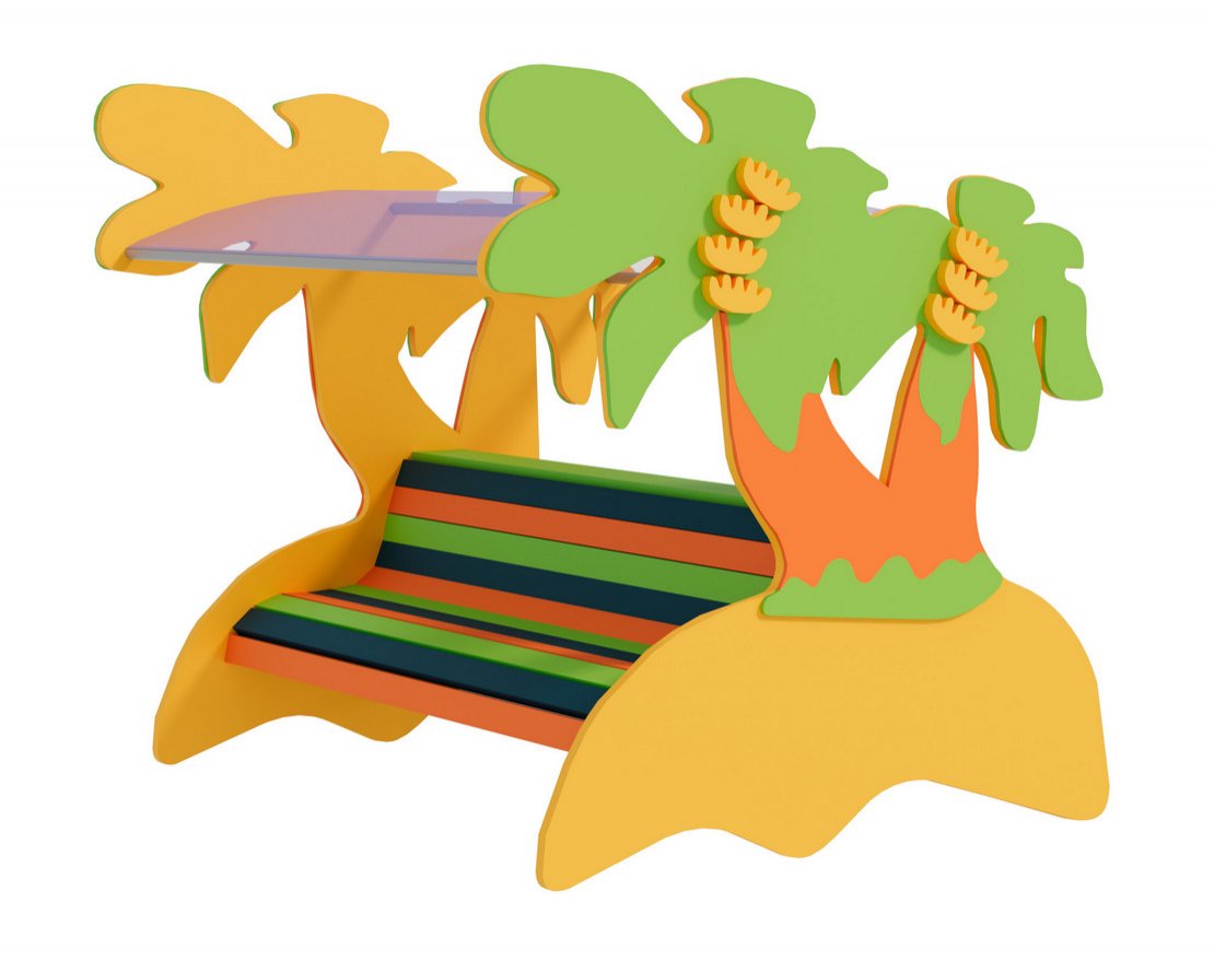 Скамейка двухсторонняя с теневым навесом обеспечивает детям дошкольного возраста комфортную прогулку – как в жаркий солнечный день, так и при лёгкой непогоде, например, во время дождя. Она имеет яркий, привлекательный облик, развивающий детскую фантазию – боковые стойки выполнены в форме пальм, а сама скамеечка и её спинка построены из разноцветных дощечек. Крытая конструкция лавочки и её широкие сиденья, расположенные в два ряда, позволяют дошкольникам отдыхать после активных игр или пережидать плохую погоду в безопасных для здоровья условиях. Изделие установлено на металлических стойках. Места для сидения, подлокотники и декоративные фигурки изготовлены из влагостойкой фанеры, а крыша – из прозрачного листа поликарбоната.